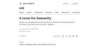 While most of the poems have a spiritual undertone, the prose varies in subject— reports Gulf News about Jaihoon's first book.
